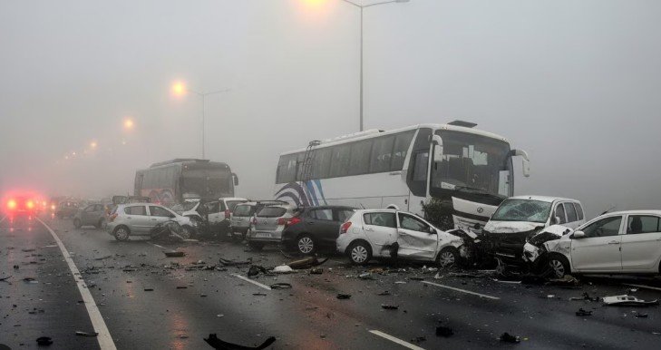 प्रत्यक्षदर्शियों के अनुसार सुबह करीब 5–6 बजे के बीच कोहरा इतना घना था कि आगे का रास्ता साफ दिखाई नहीं दे रहा था। इसी दौरान एक वाहन के अचानक ब्रेक लगाने से पीछे से आ रही गाड़ियाँ संभल नहीं पाईं और चेन-रिएक्शन टक्कर हो गई। टक्कर में कार, SUV और एक ट्रक सहित कई वाहन क्षतिग्रस्त हो गए।